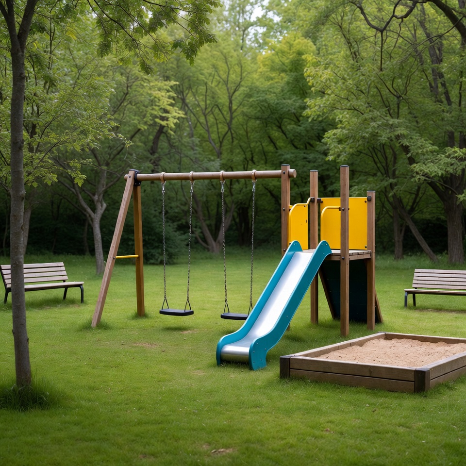 A wooden playground structure with yellow slide, swings, and sandbox sits in a lush green park surrounded by dense trees. Nearby wooden benches flank the grassy area. The equipment stands on fresh green grass under a canopy of green foliage.