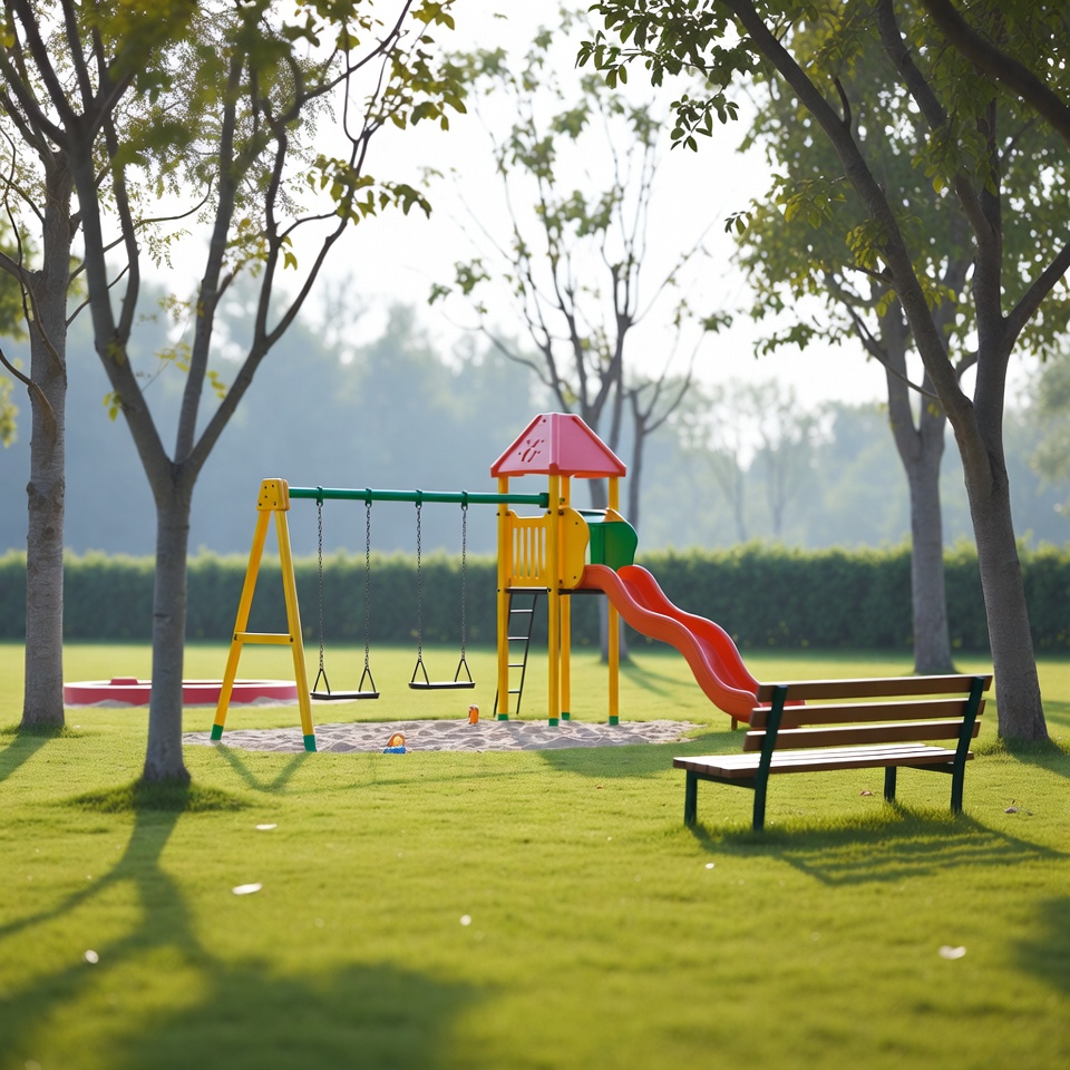 A colorful playground structure features yellow swings, a red slide, and climbing equipment on a grassy field. Tall green trees surround the play area, with a wooden bench nearby. The scene is set in an open park with soft sunlight filtering through the branches.