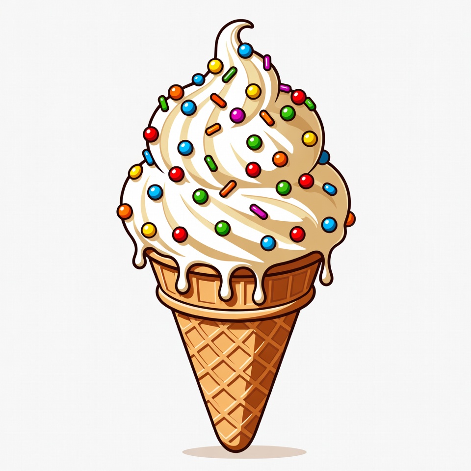 A colorful cartoon illustration of a vanilla soft serve ice cream in a waffle cone. The ice cream is topped with multicolored sprinkles and drips slightly over the cone edge. It is isolated on a white background.