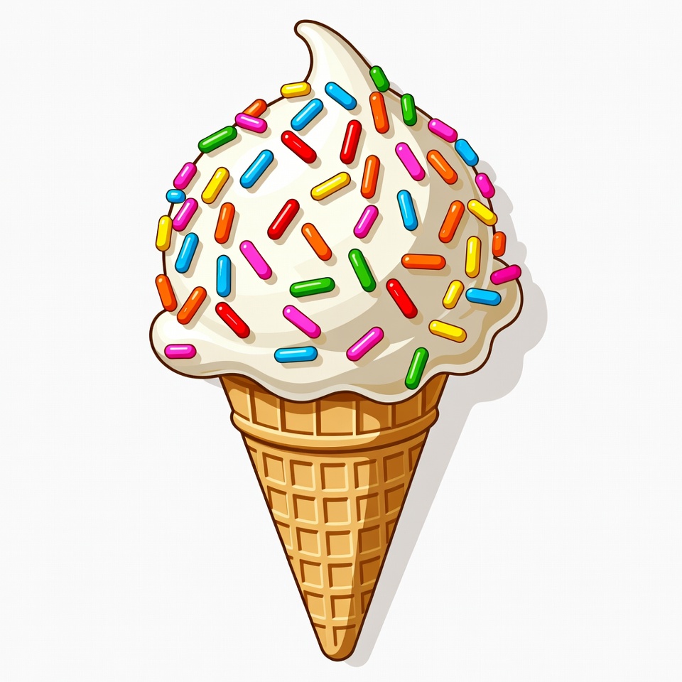 cartoon, clipart, colorful sprinkles, cone, dessert, food, graphic, illustration, isolated background, soft serve, sprinkles, sweet, treat, vanilla ice cream, vector, waffle cone, ice cream