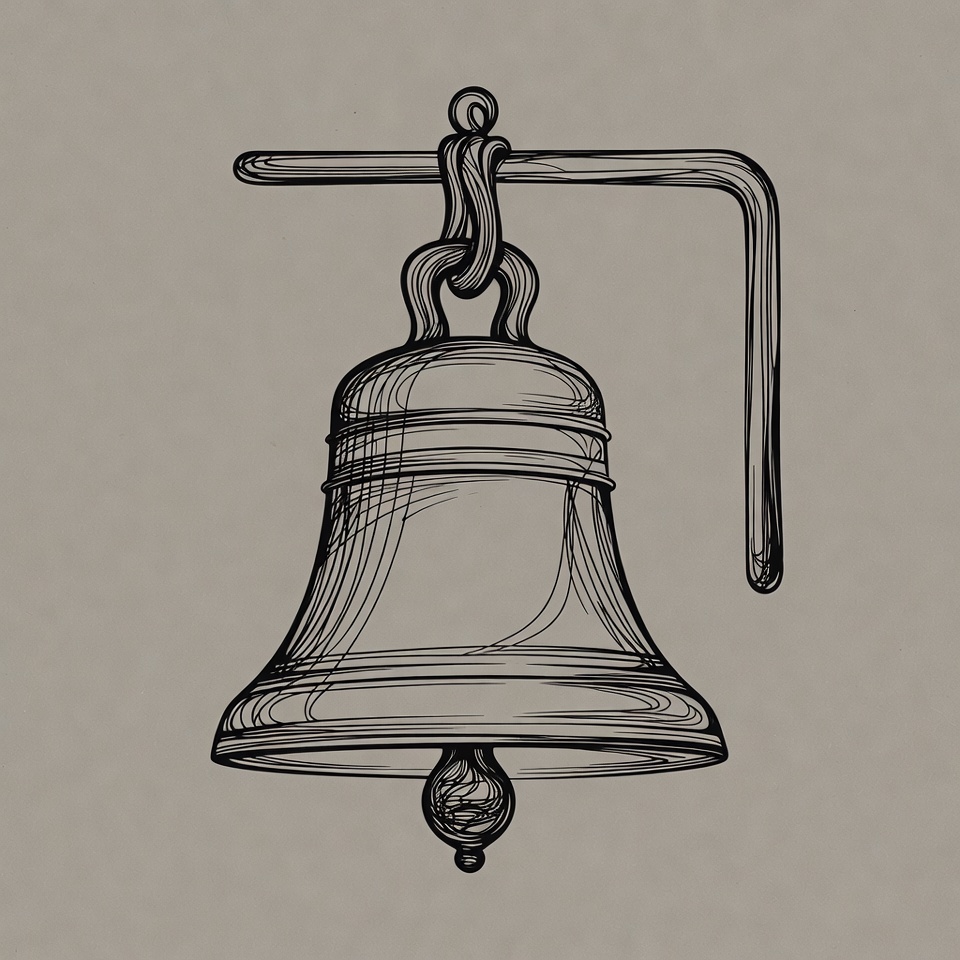 bracket, church bell, clapper, decorative bell, hanging bell, illustration, ink drawing, isolated background, line drawing, metal bell, rope, sketch, vector art, vintage bell, bell