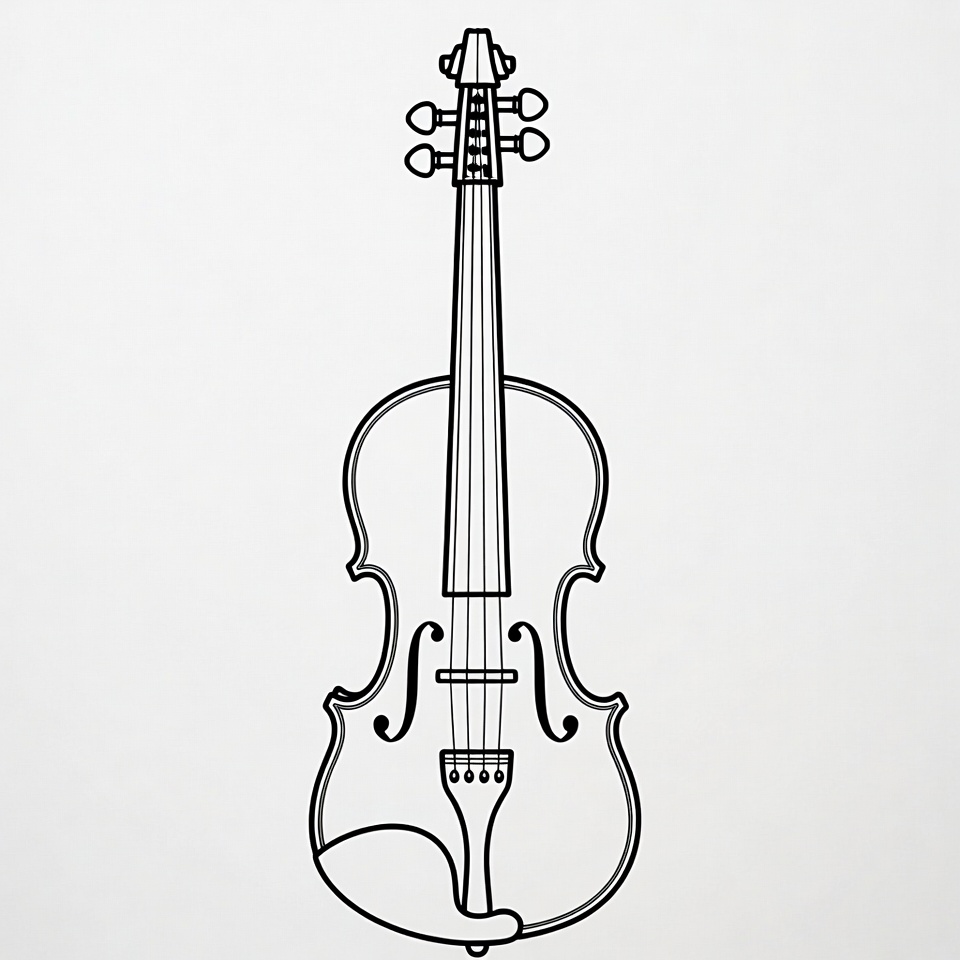bridge, clipart, drawing, f-holes, fiddle, fingerboard, illustration, isolated background, line art, musical instrument, outline, pegs, scroll, strings, tailpiece, vector, white background, violin