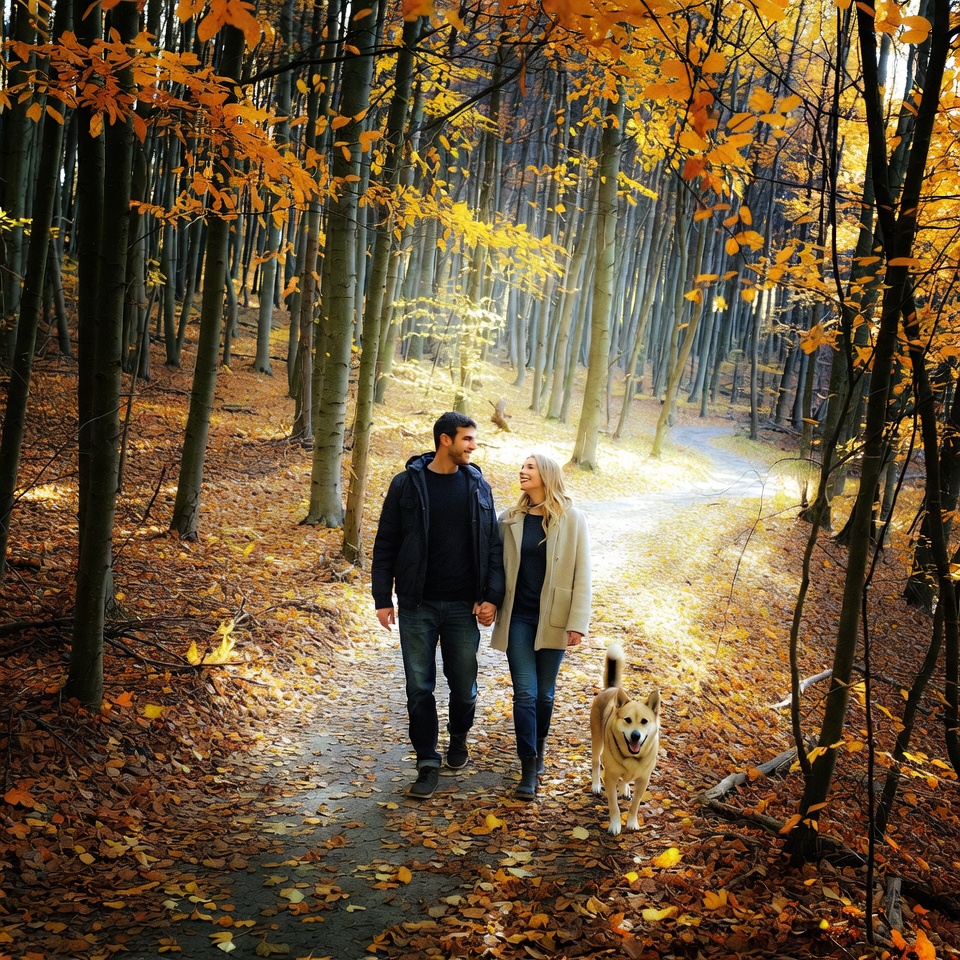 A man and woman hold hands while walking their dog on a leaf-covered path through a dense forest of tall trees with vibrant yellow and orange fall foliage. The man wears a dark jacket and jeans, and the woman is dressed in a light coat. Sunlight filters through the trees, illuminating the golden autumn scene.