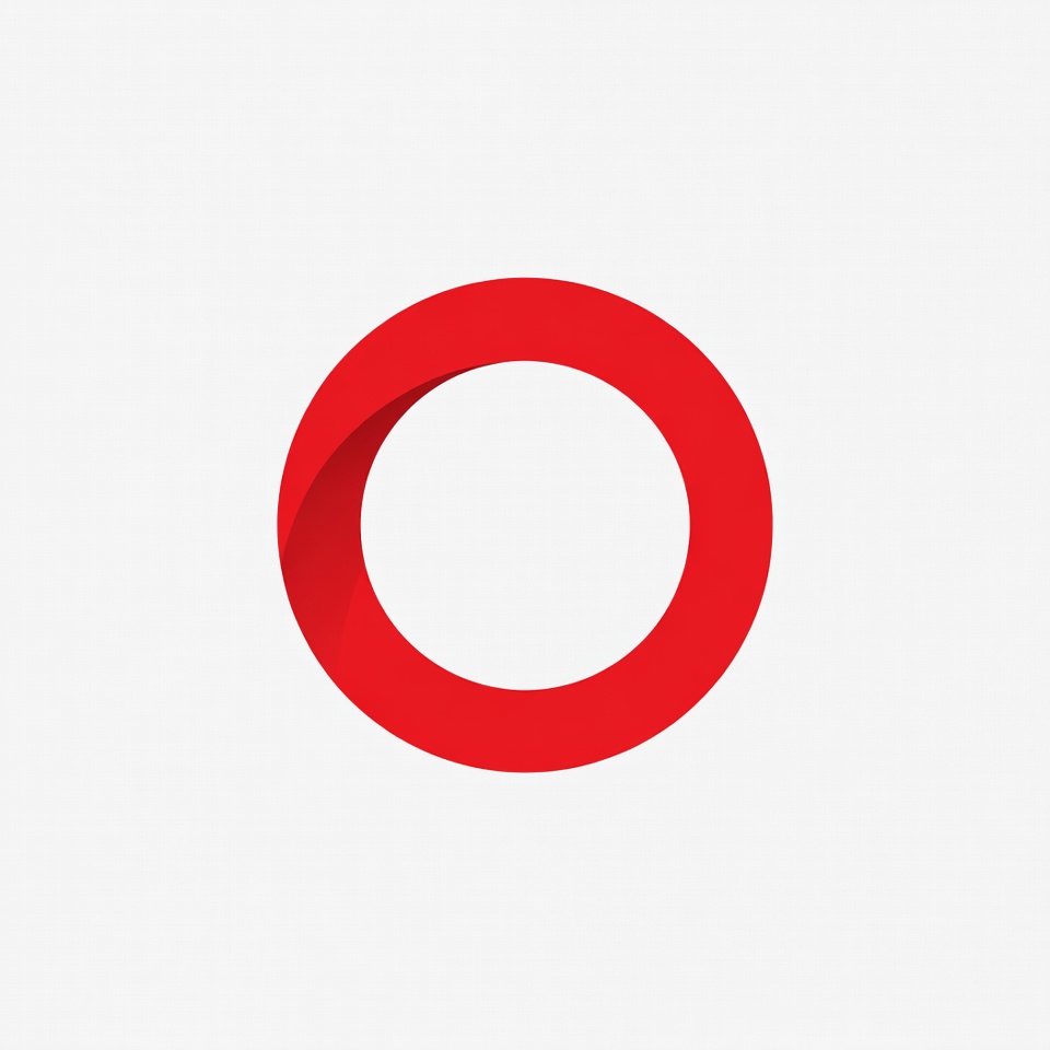 A vibrant red circle with a subtle twist in its stroke is centered on a plain white background. The design features a clean, modern vector style with sharp edges and a hollow interior.