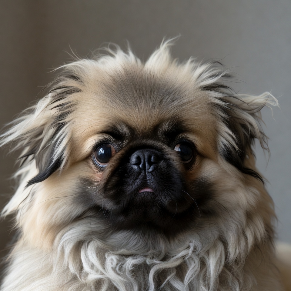 A fluffy Pomeranian dog with long beige fur stares directly at the camera. Its large dark eyes and black nose are prominent in the close-up portrait. The dog is positioned against a plain light gray background.