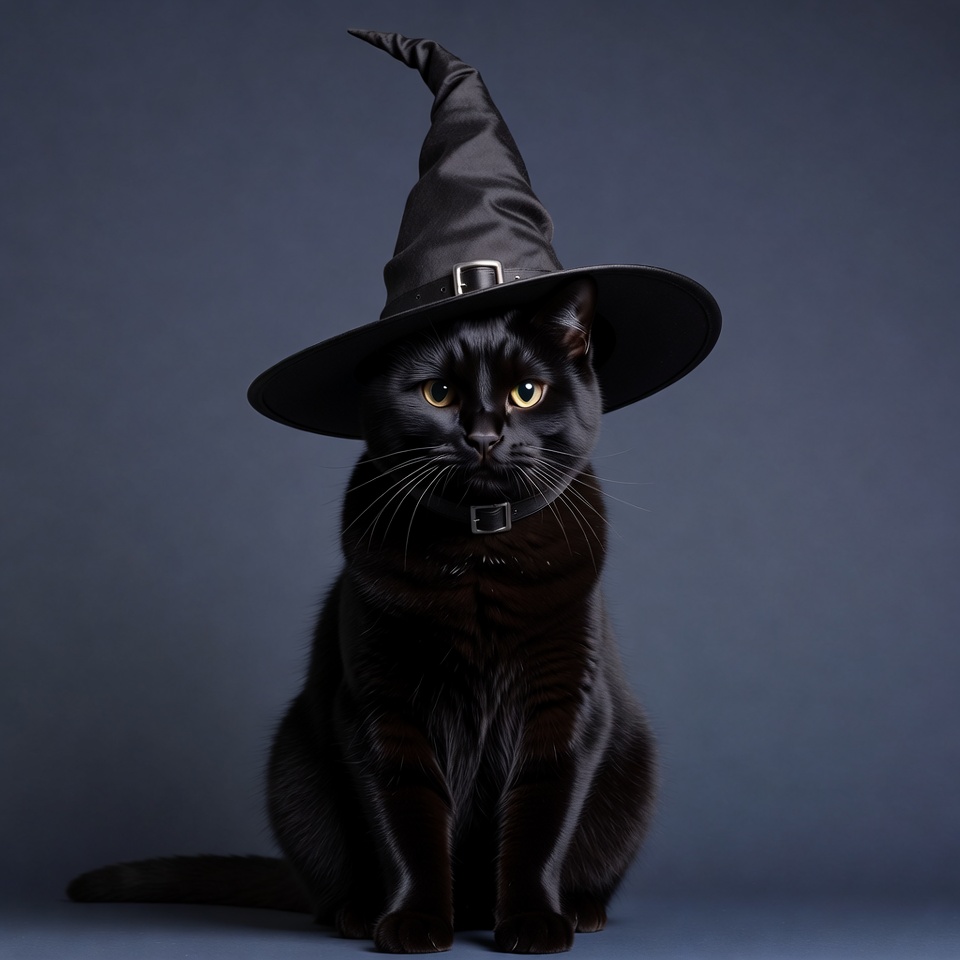 A black cat sits on a dark blue background wearing a large black witch hat with a buckle. The cat has yellow eyes and a silver collar. It faces forward with a serious expression.