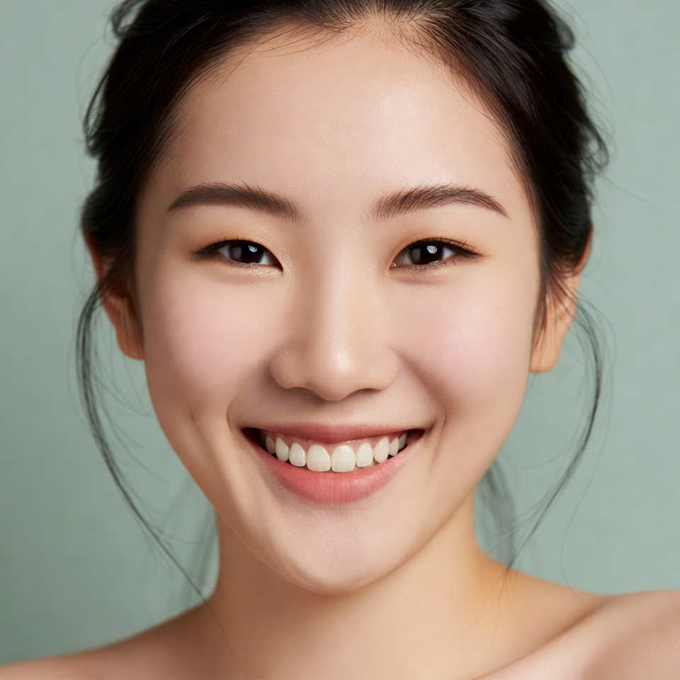 A young Asian woman with long dark hair in an updo smiles warmly at the camera. She has smooth skin, defined eyebrows, and bright eyes against a light green background. Her lips are lightly glossed, showing white teeth in a genuine smile.