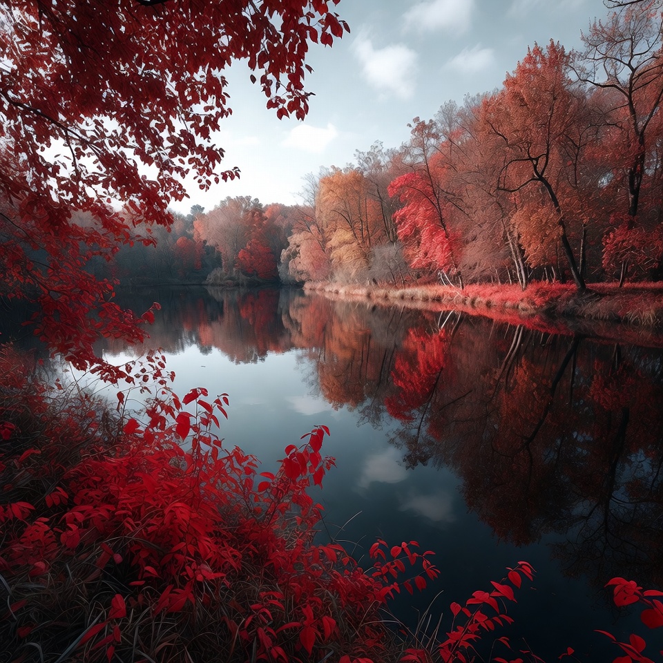 A serene lake reflects a dense forest of trees with vibrant red and orange autumn foliage. Overhanging branches frame the scene, with their colorful leaves mirrored perfectly in the calm water. The sky above shows soft clouds in a striking red-toned landscape.