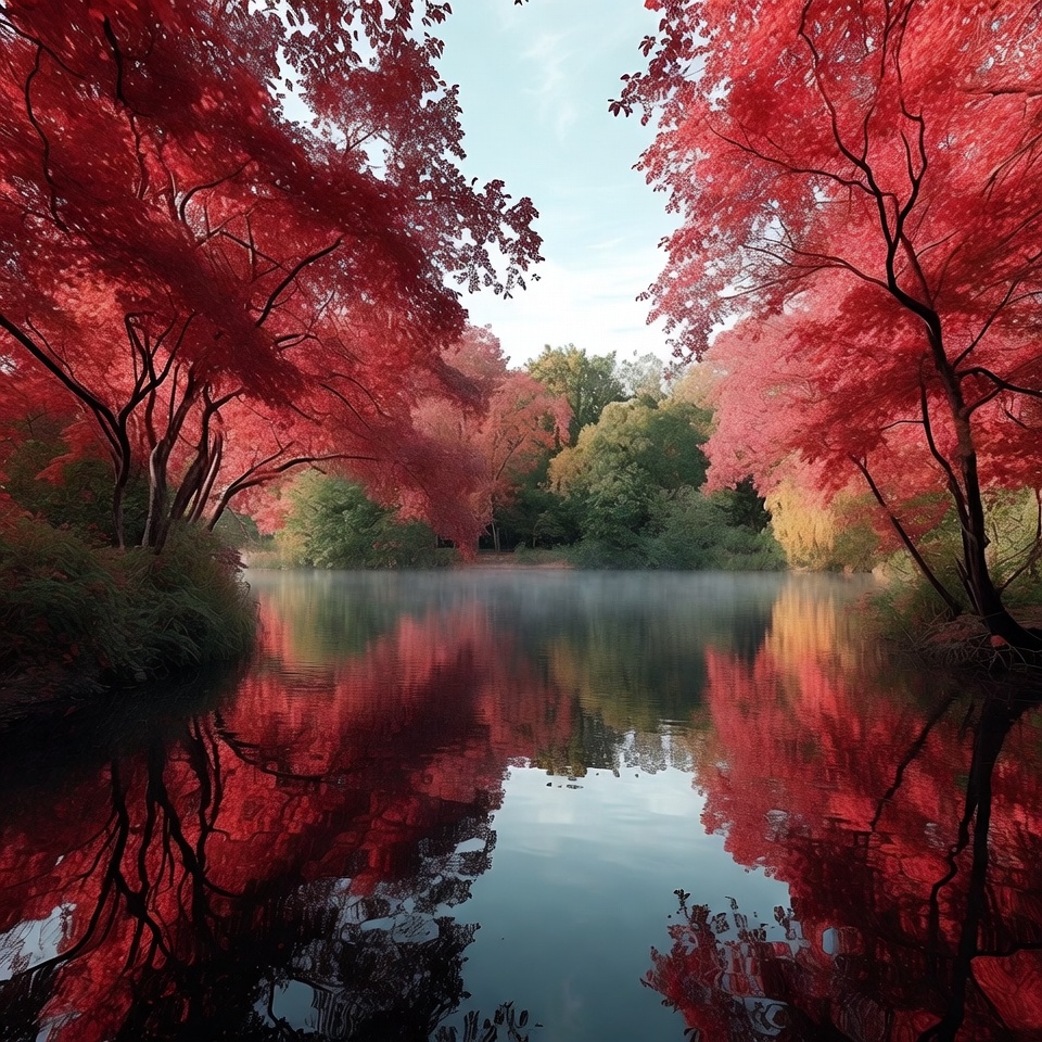 arched trees, autumn forest, autumn scenery, calm lake, crimson leaves, fall colors, fall foliage, foliage reflection, forest path, green trees, lake mirror, maple trees, misty sky, nature landscape, nature scene, peaceful lake, red leaves, red maples, reflective water, seasonal landscape, serene water, vibrant colors, water reflection, woodland lake, autumn trees