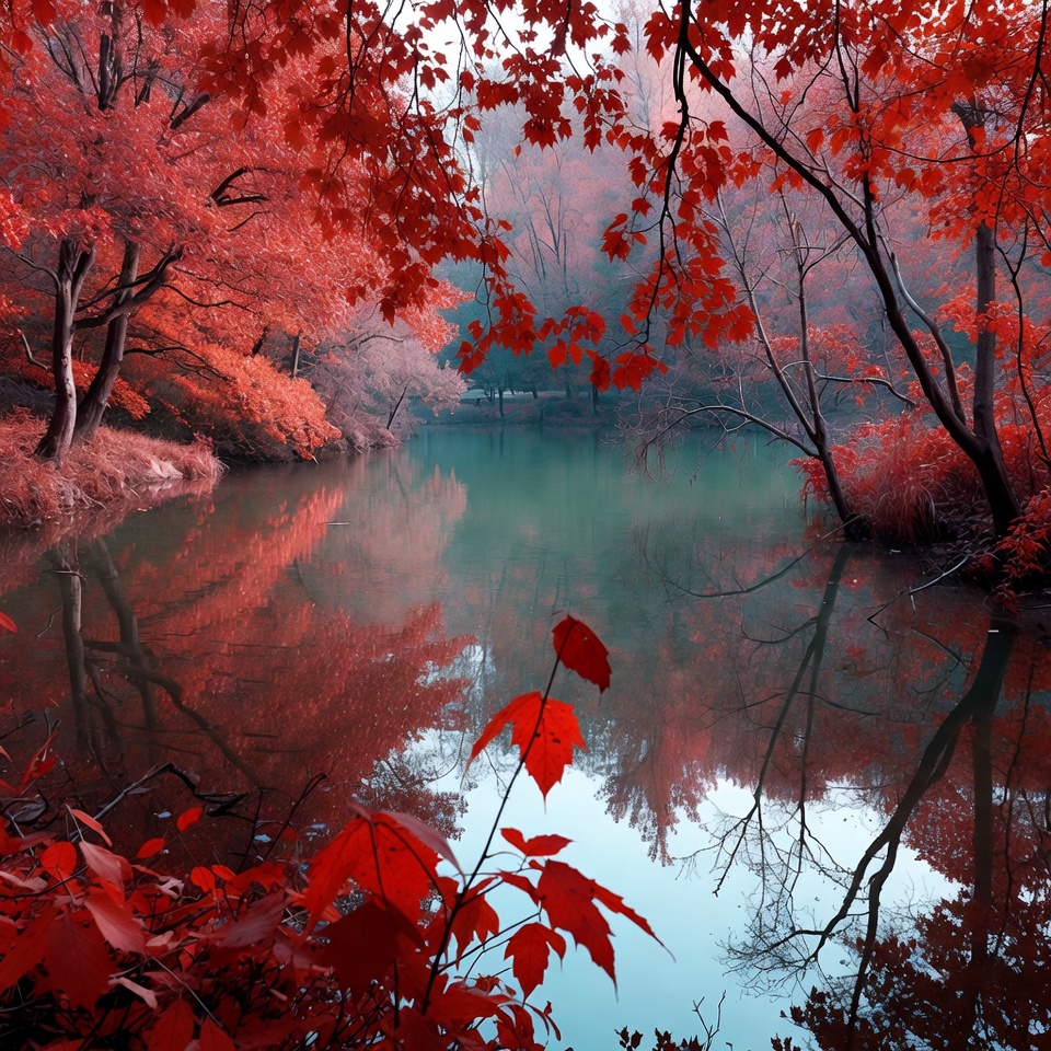 autumn landscape, autumn pond, branches, fall colors, foliage, foliage reflection, forest, lake, leaf reflections, maple trees, mist, natural beauty, nature, pond, red forest, red leaves, reflection, scenic view, serene lake, trees, vibrant red, water, woods, autumn trees