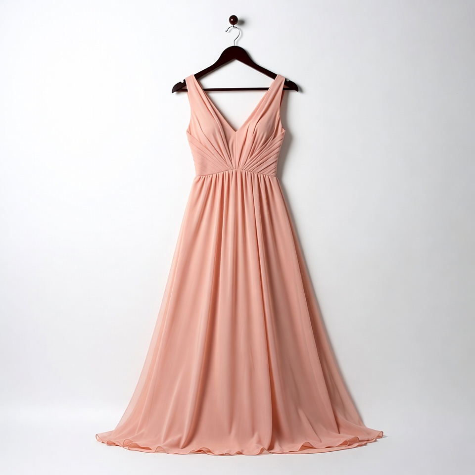 V-neck dress, apparel, bridesmaid dress, chiffon dress, clothing, dress on hanger, elegant dress, evening gown, fashion, formal dress, hanging dress, isolated background, long dress, maxi dress, pinkish dress, ruched dress, sleeveless dress, white background, wooden hanger, peach dress