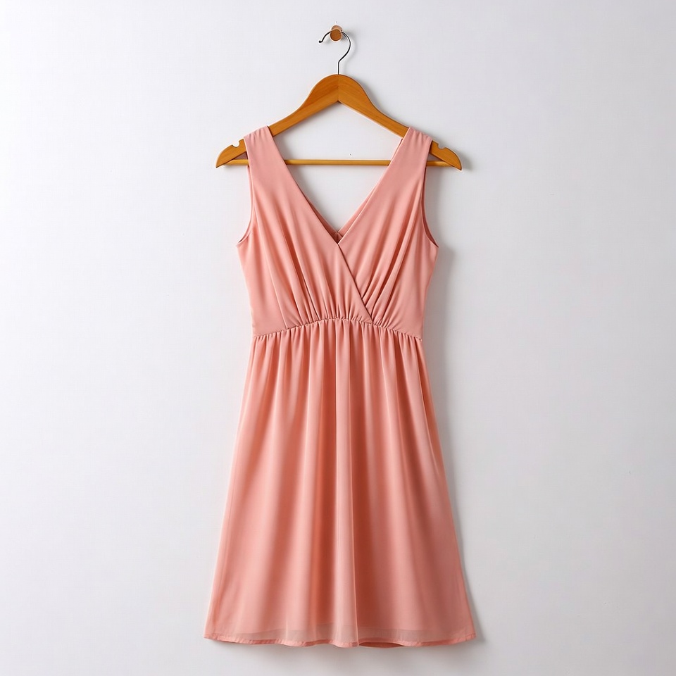 V-neck dress, apparel, casual dress, chiffon dress, clothing, dress on hanger, elegant dress, fashion, isolated background, knee-length dress, sleeveless dress, summer dress, women's dress, wooden hanger, wrap dress, pink dress