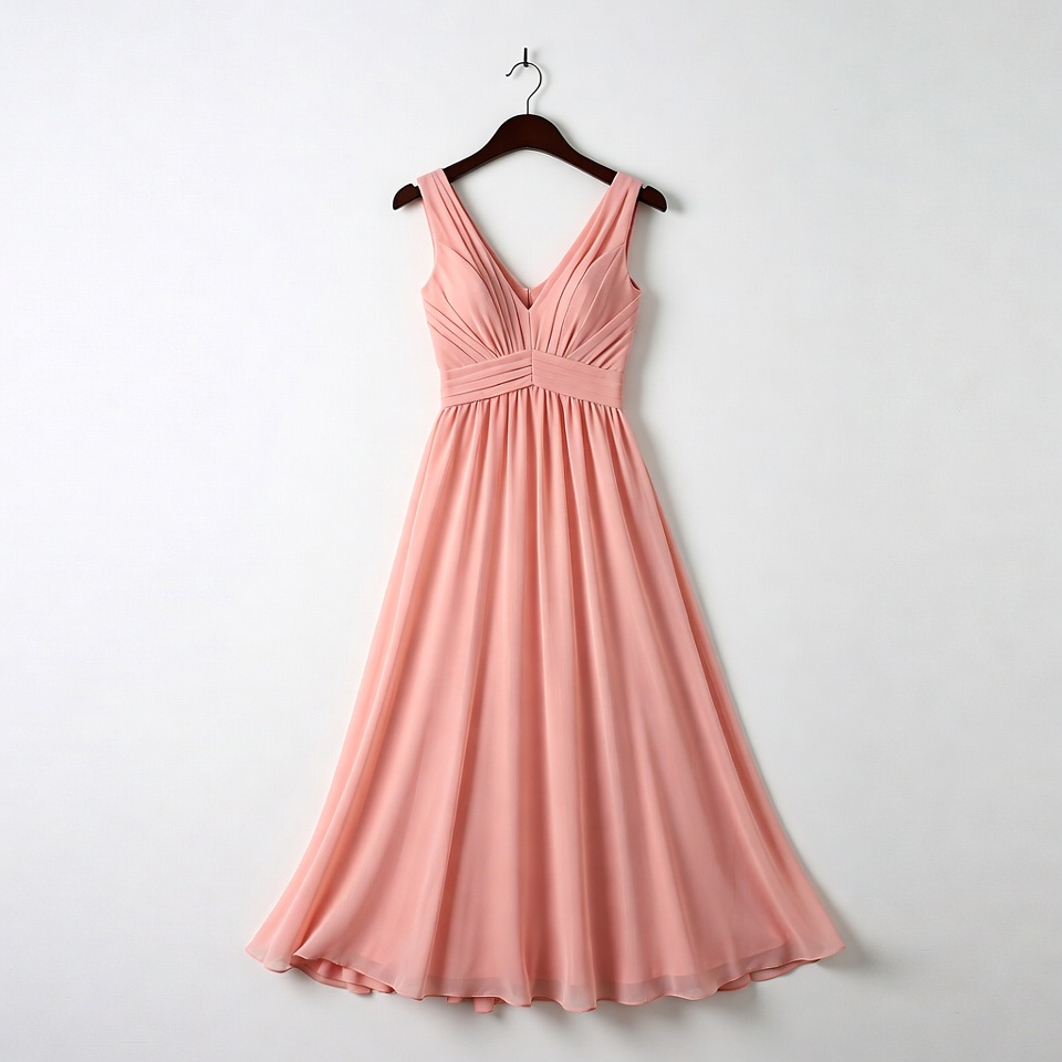 V-neck dress, chiffon dress, dress on hanger, elegant dress, evening dress, flowing skirt, formal dress, hanger, lightweight fabric, midi dress, pleated bodice, sleeveless dress, white background, women's dress, pink dress