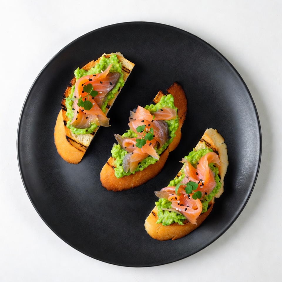 Three pieces of toasted bread topped with creamy green avocado, pink smoked salmon slices, and garnished with sesame seeds and fresh herbs sit on a black round plate. The toasts are arranged in a triangular formation against a white background. The dish is presented from a top-down view, highlighting the vibrant colors and textures.