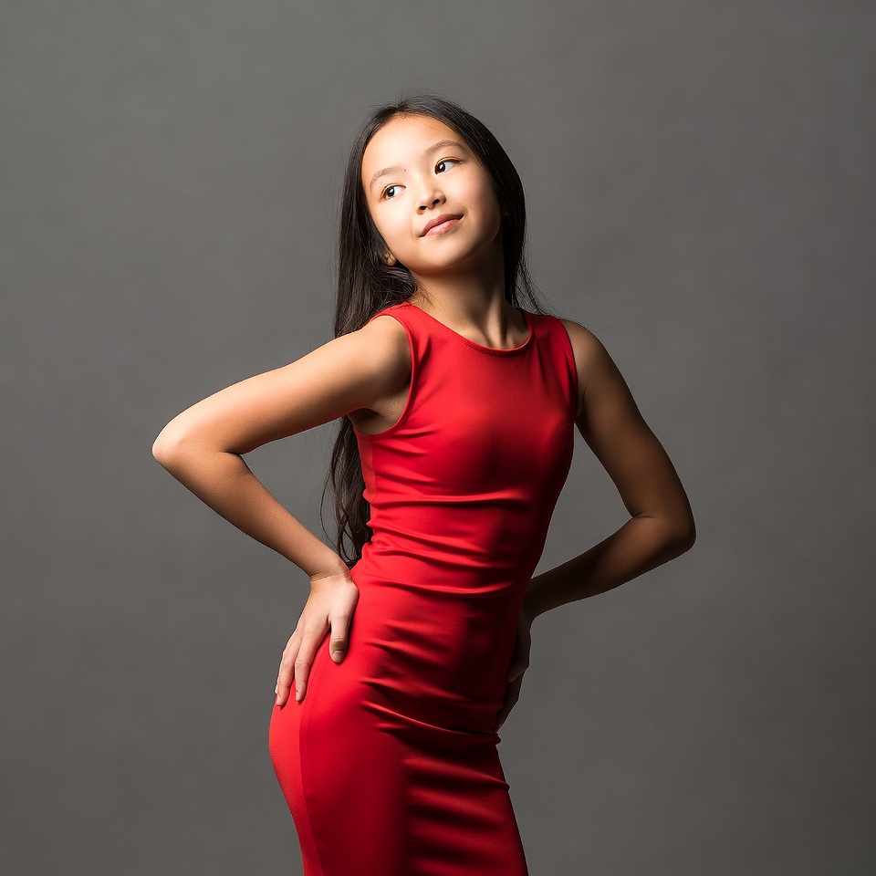 Asian, dark hair, female, fitted dress, girl, gray background, hands on hips, long hair, portrait, posing, red dress, side pose, sleeveless dress, smile, thoughtful expression, young girl, Asian girl