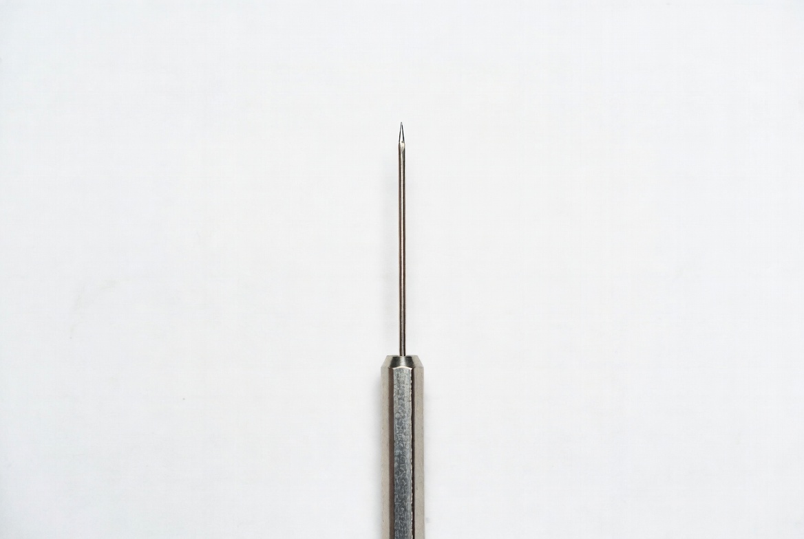 A close-up view of a thin metal needle with a sharp point stands vertically against a plain white background. The needle has a metallic gray shaft and a small cylindrical base. It is isolated with no other objects visible.