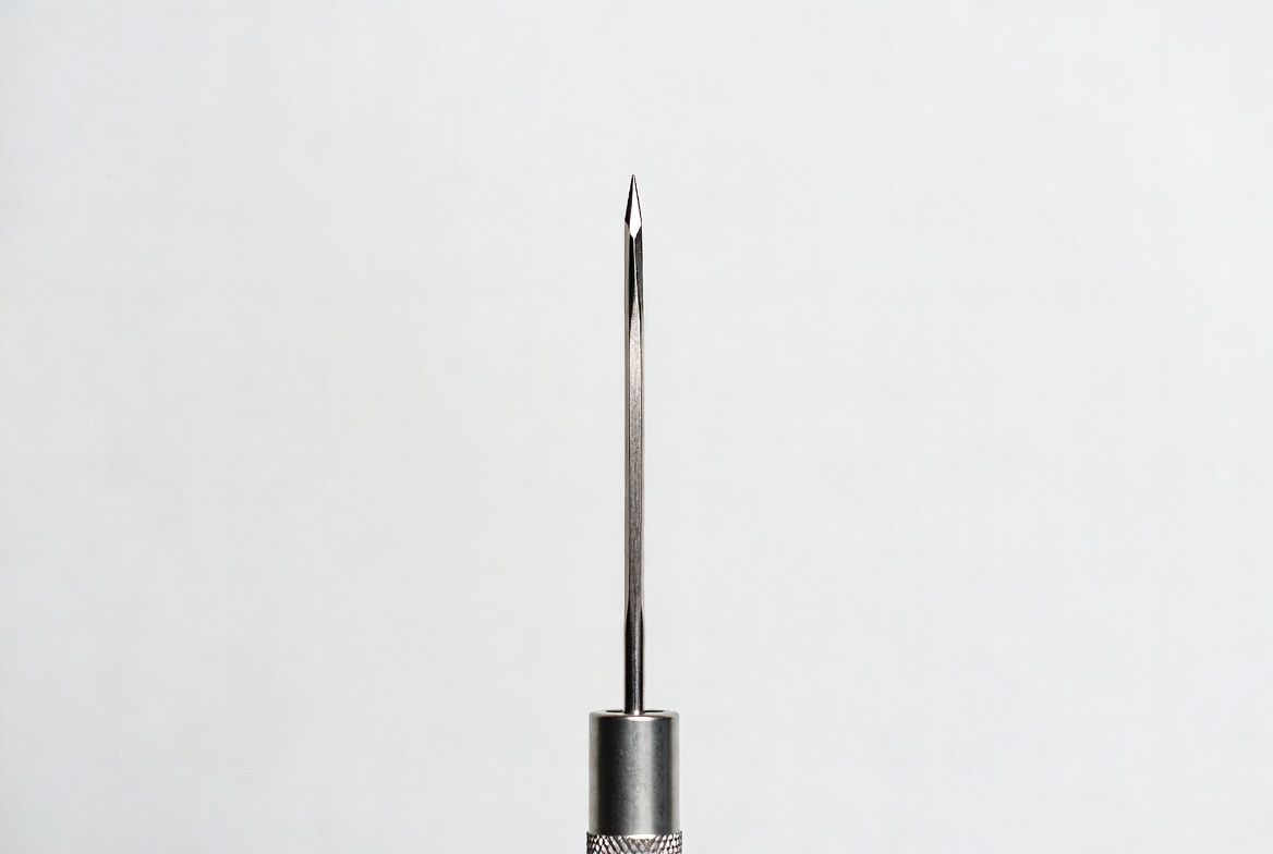 close-up, gray base, isolated, metal needle, piercing needle, pointed tip, sewing needle, sharp needle, straight needle, tool, white background, needle
