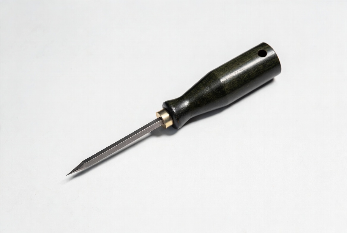 brass ring, craft tool, dark wood, hand tool, isolated background, leather awl, metal tip, pointed tip, sewing awl, sharp tool, stitching awl, tool, wooden handle, woodworking tool, awl