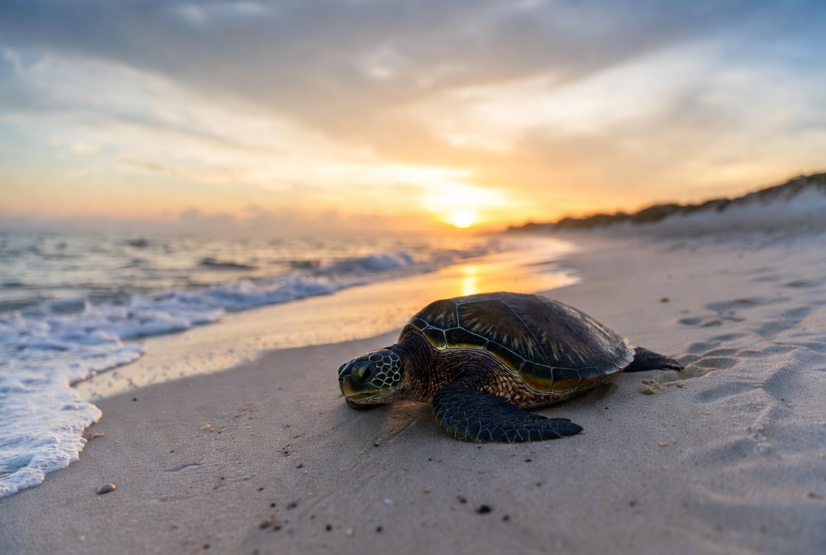 A green sea turtle rests on a sandy beach with gentle waves lapping at its side. The scene is illuminated by a vibrant sunset sky with orange and pink hues reflecting on the ocean. The turtle's shell shows distinctive green and black patterns.