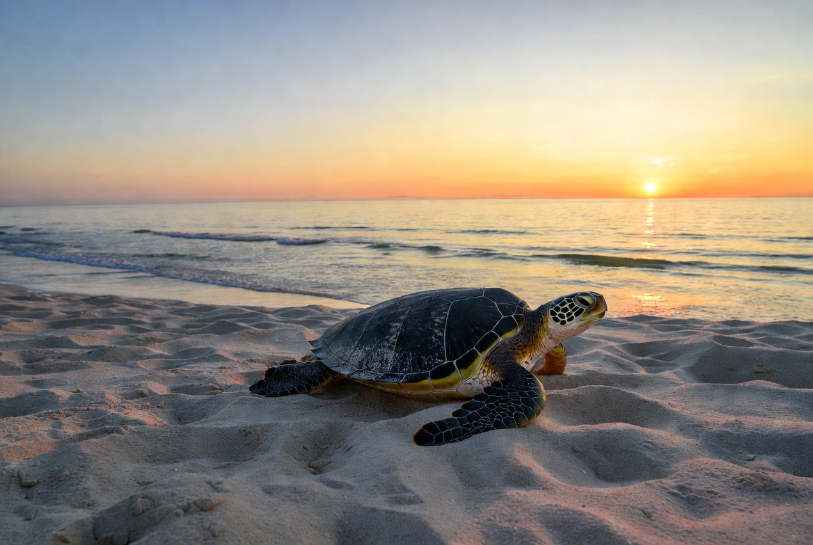 A green sea turtle crawls on a sandy beach during sunset. The turtle's dark shell with yellow edges contrasts against the white sand and gentle waves. Vibrant orange and pink skies reflect on the calm ocean water.