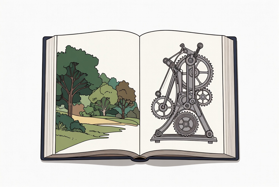 Open book with forest and mechanism illustration