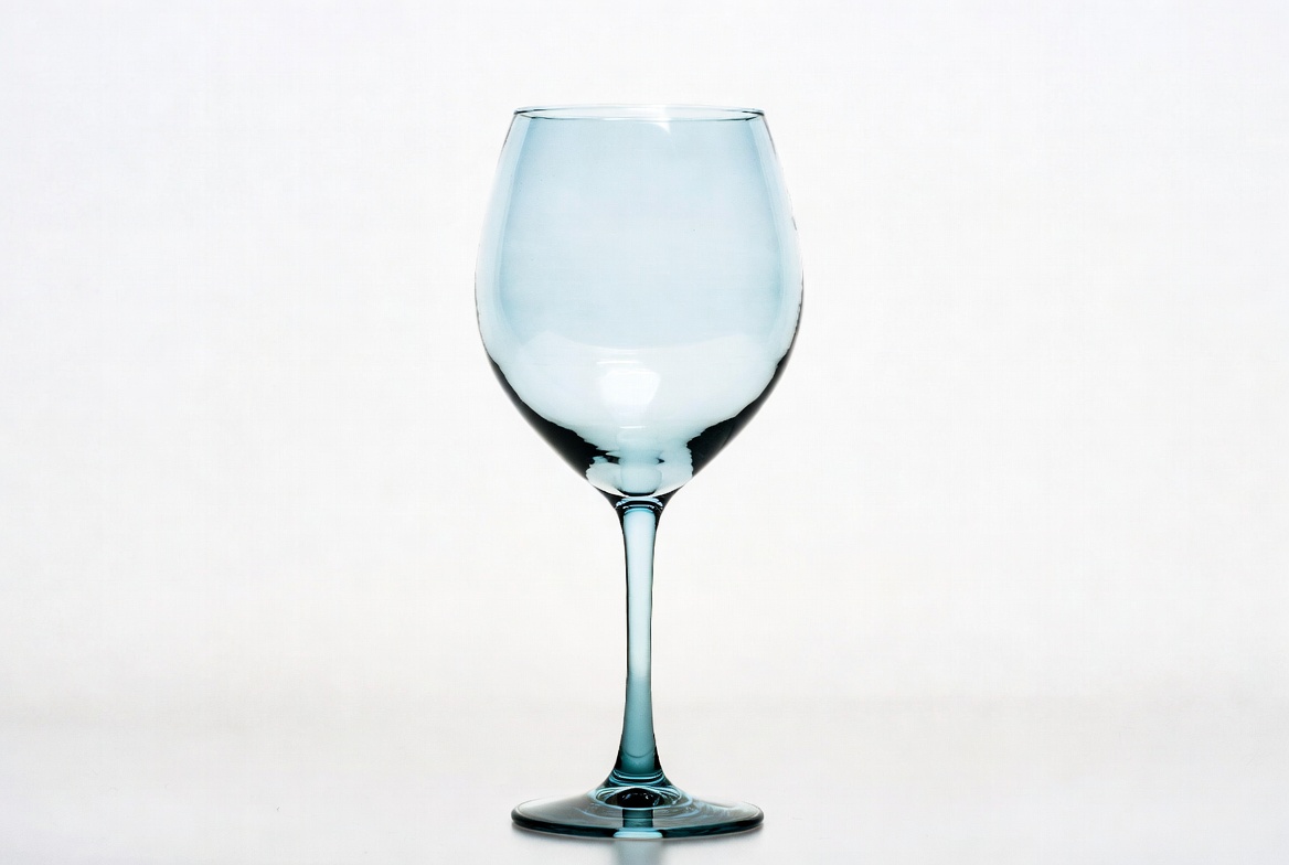 blue glass, blue tint, clear glass, drinkware, elegant glass, empty glass, glassware, isolated background, reflection, stemware, tableware, tall stem, white background, wide bowl, wine glass