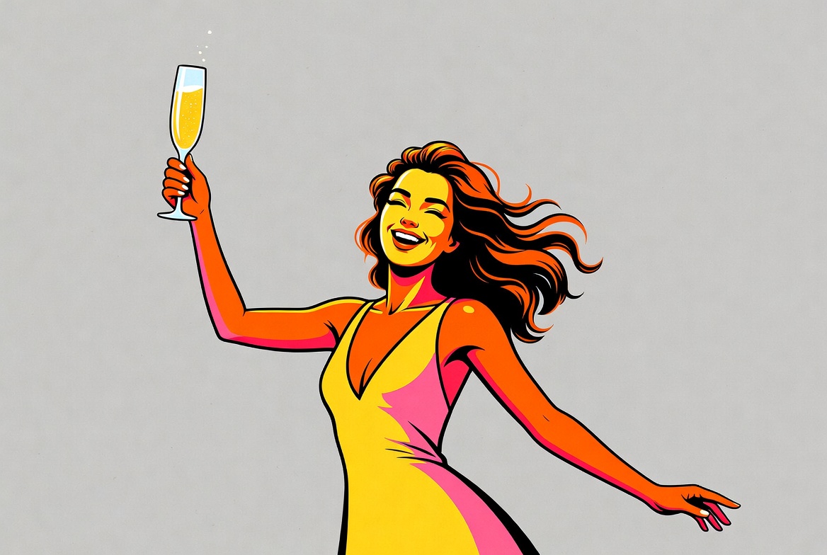 A vibrant pop art illustration of a smiling woman with long wavy brown hair holds up a champagne flute glass. She wears a low-cut yellow dress and dances with one arm raised and the other extended. The figure is set against a plain gray background.