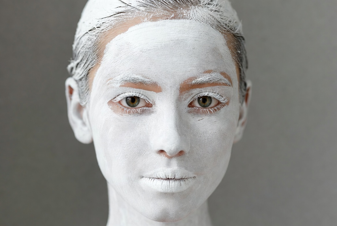 A close-up portrait of a woman with her face and hair covered in thick white paint or makeup. Her green eyes and subtle facial features are visible through the white coating. She gazes directly at the camera against a plain gray background.