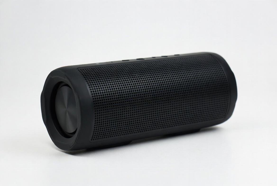 audio device, black speaker, control buttons, cylindrical speaker, electronics, gadget, isolated background, music player, portable speaker, rubber texture, rugged speaker, sound system, speaker grille, wireless speaker, Bluetooth speaker