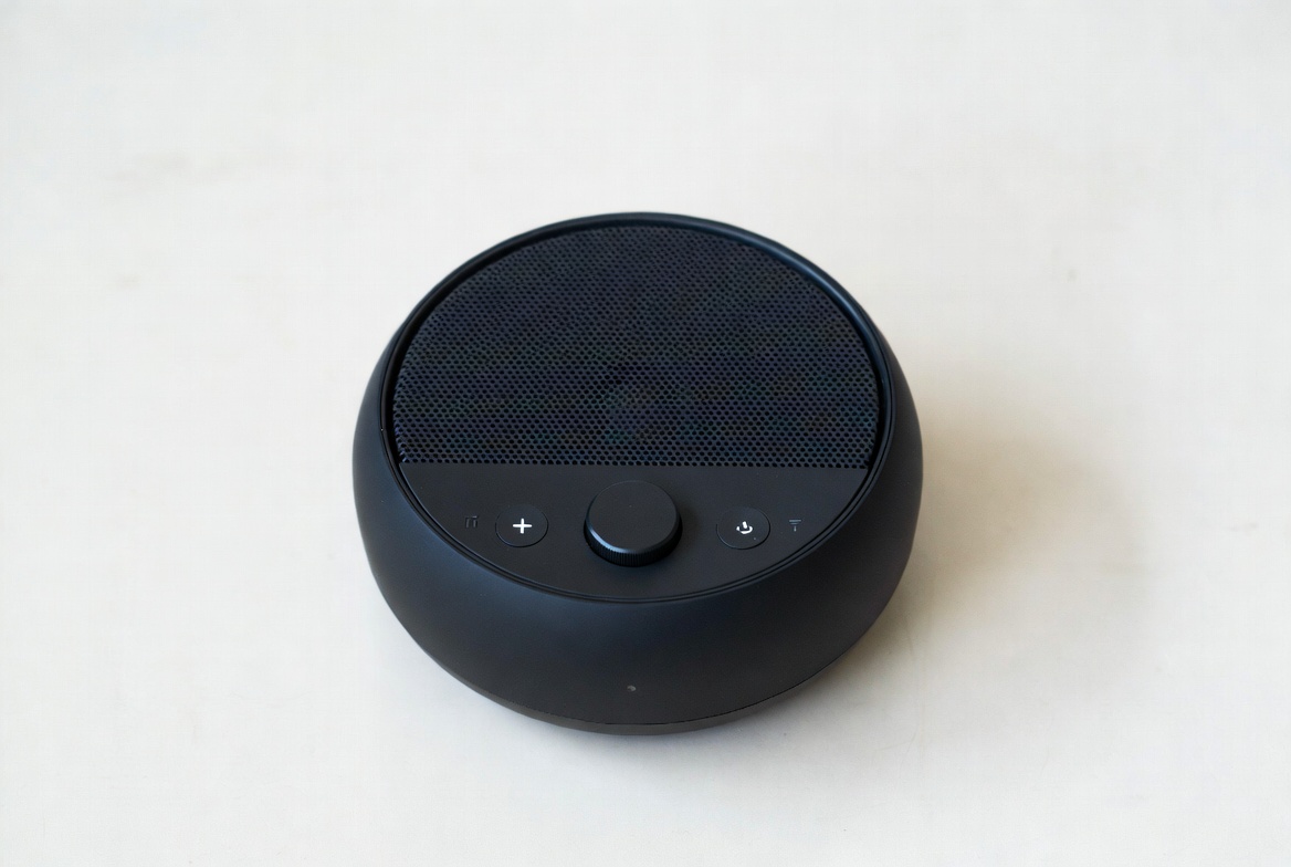 audio device, black speaker, buttons, compact speaker, controls, gadget, isolated, mesh grille, music player, portable speaker, round speaker, sound speaker, technology, white background, wireless speaker, Bluetooth speaker