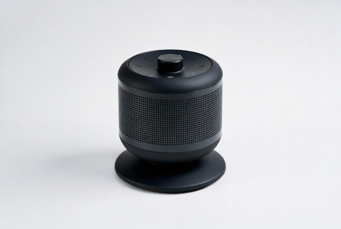 audio device, black base, black speaker, bluetooth speaker, cylindrical speaker, electronics, gadget, isolated background, mesh speaker, modern speaker, portable speaker, sound speaker, touch controls, wireless speaker, speaker