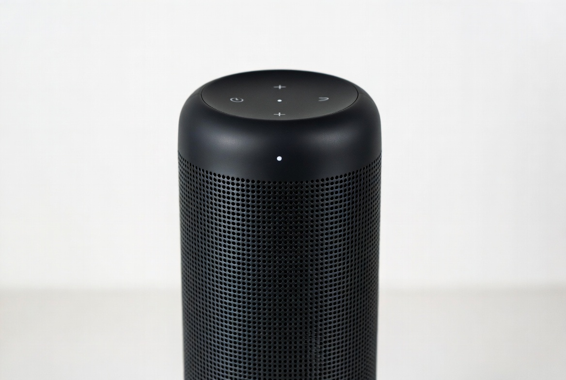 audio device, black speaker, control buttons, cylindrical speaker, gadget, isolated background, matte black, modern speaker, music player, portable speaker, sound speaker, speaker grille, technology, top controls, wireless speaker, bluetooth speaker