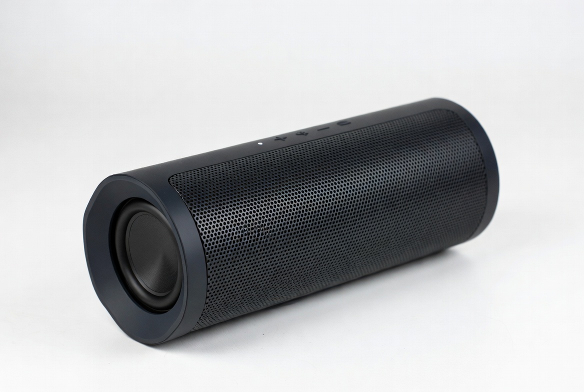audio device, black speaker, control buttons, cylindrical speaker, electronics, gadget, isolated background, mesh grille, music player, portable speaker, sound system, wireless speaker, Bluetooth speaker
