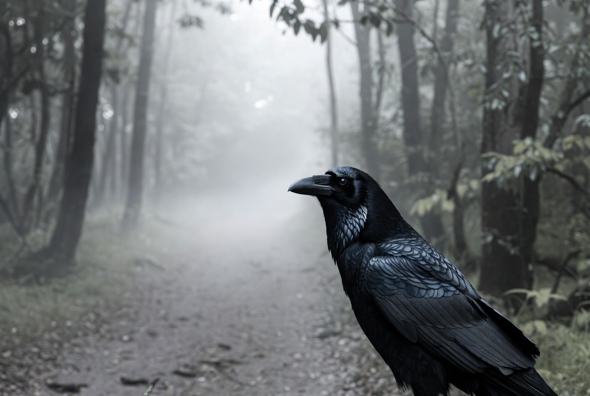 Raven on misty forest path