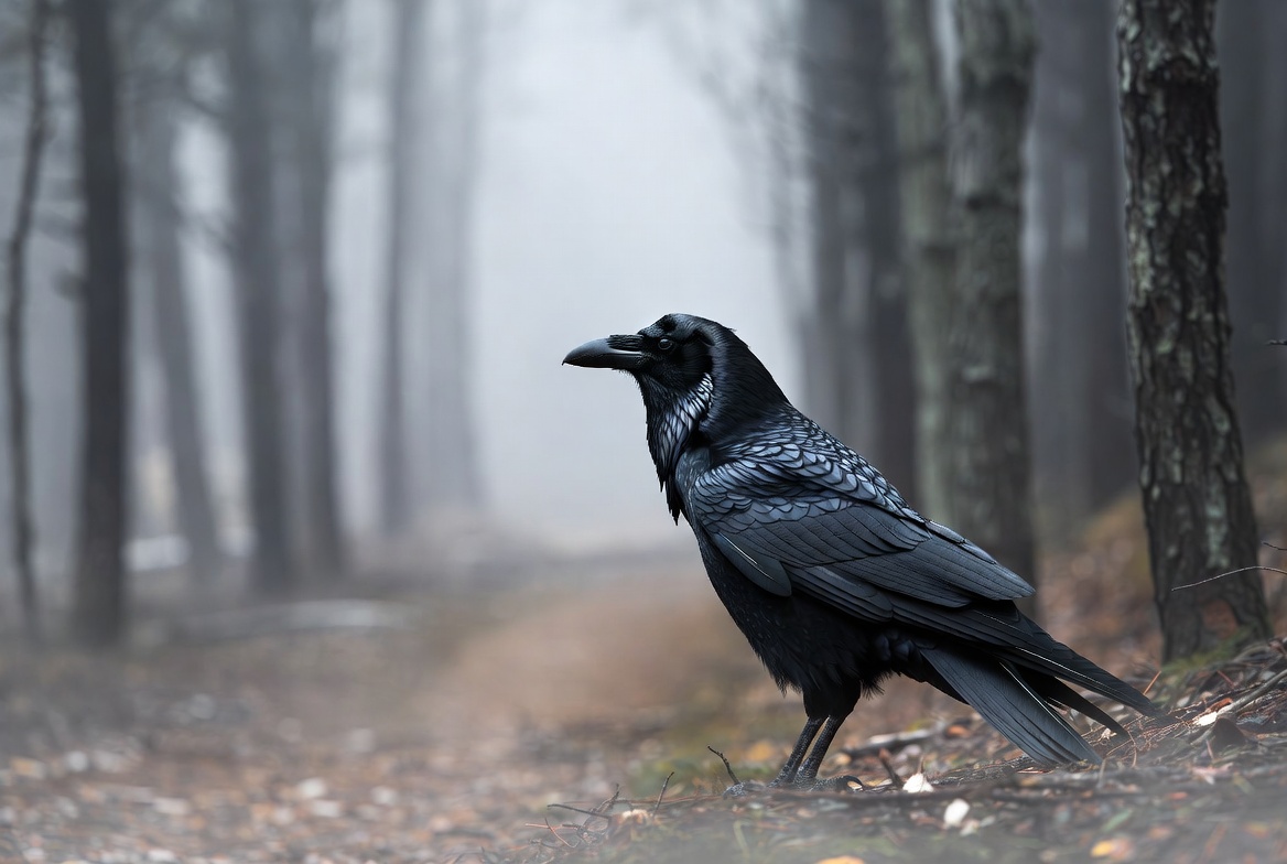 Raven standing in misty forest