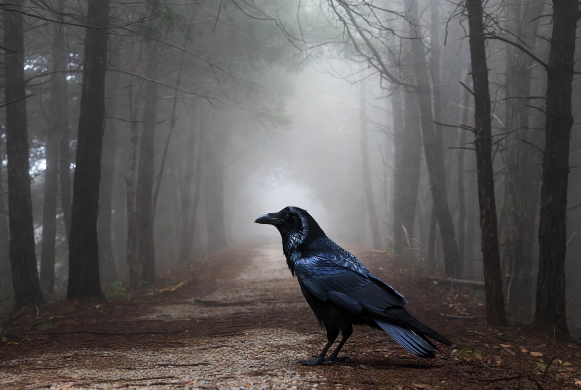 animal, birdwatching, black bird, crow, dark forest, eerie atmosphere, fog, foggy woods, forest, mist, mysterious forest, nature, path, pine trees, standing bird, trail, trees, wildlife, woodland path, raven
