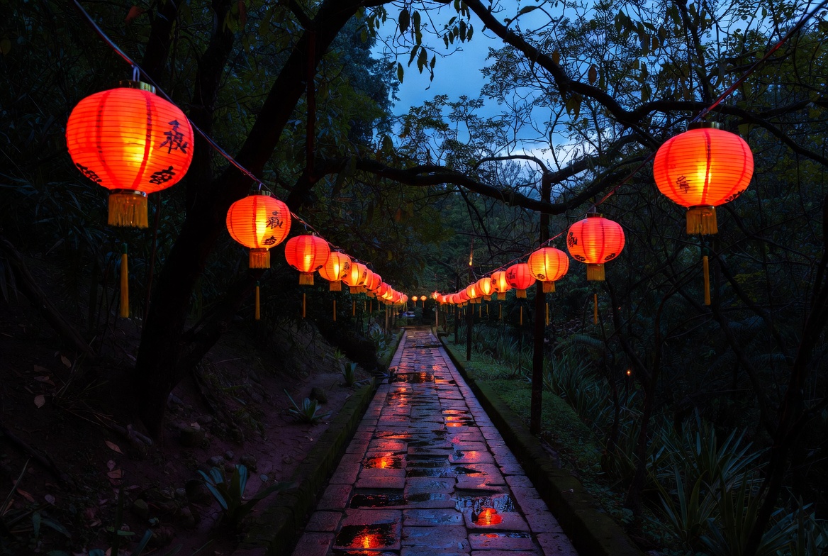 Asia, Chinese lanterns, celebration, dark background, dusk, festival, foliage, forest, garden path, hanging lanterns, illuminated path, lantern string, lanterns, lights, night, outdoor, pathway, red lights, serene path, stone path, tassels, traditional lanterns, trail, trees, wet stones, red lanterns