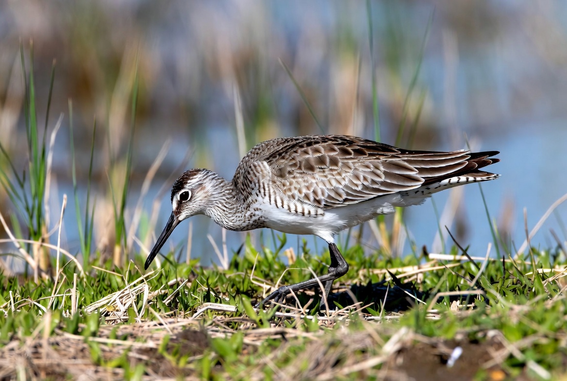 beak, bird, birdwatching, brown bird, feathers, foraging, grass, green grass, long bill, marsh, nature, reeds, shallow water, shorebird, wader, water, wetlands, white belly, wildlife, whimbrel