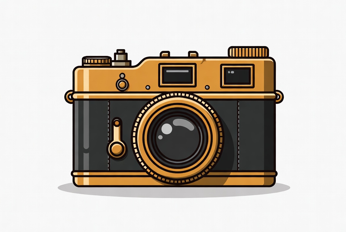 black camera, clipart, flat design, gold camera, graphic, icon, illustration, isolated background, lens, photography, retro camera, vector art, viewfinder, vintage camera, camera