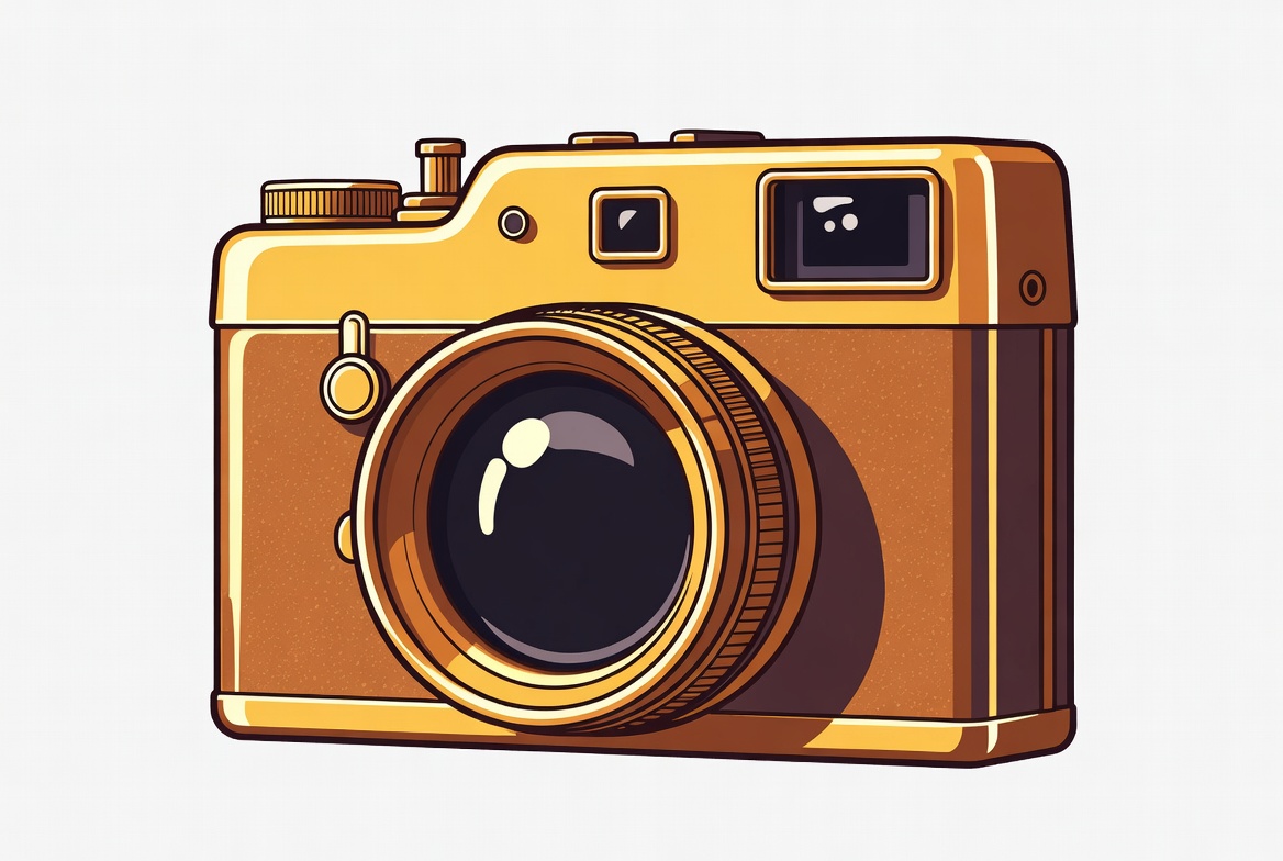 A detailed illustration of a vintage-style gold camera with a large black lens and various knobs and buttons. The camera features a retro design with smooth outlines and a subtle gradient texture. It is isolated on a white background.