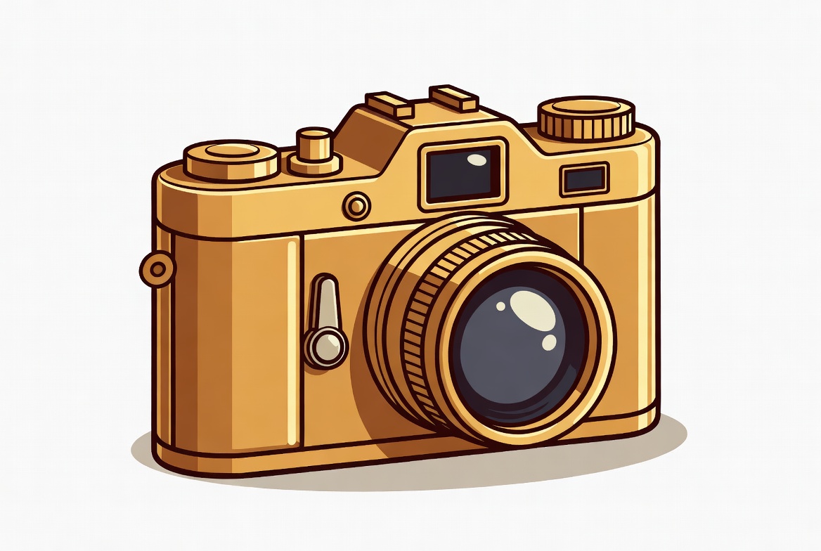 clipart, dials, flat design, gold color, golden camera, illustration, isolated background, lens, photography, retro camera, strap, vector art, viewfinder, vintage camera, camera