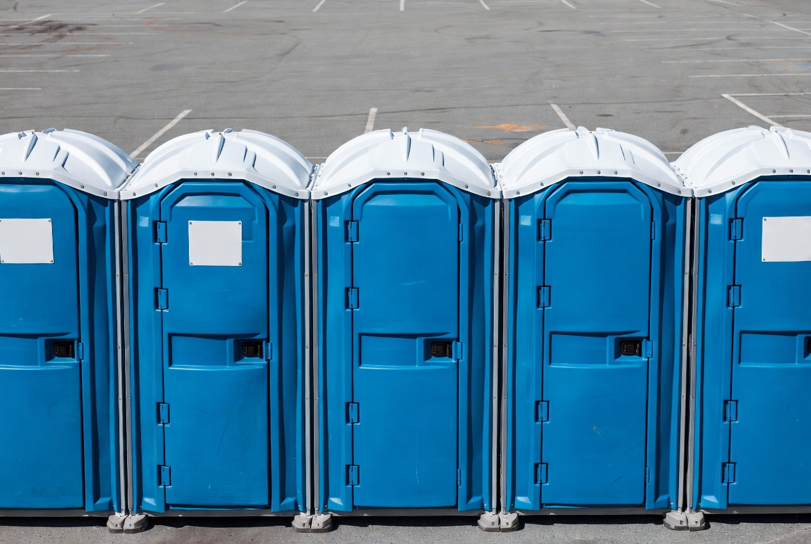 A row of five blue portable toilets stands in a line on a large empty parking lot. Each toilet has a white roof, blue doors, and white blank signs. They are positioned against a concrete surface with white lines visible.