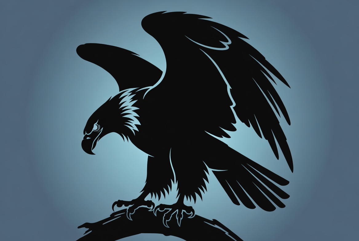 A black silhouette illustration of a majestic eagle perched on a branch with wings spread wide. The detailed outline shows sharp talons gripping the branch, a fierce beak, and feathers on the head and wings. The image is set against a blue gradient background.