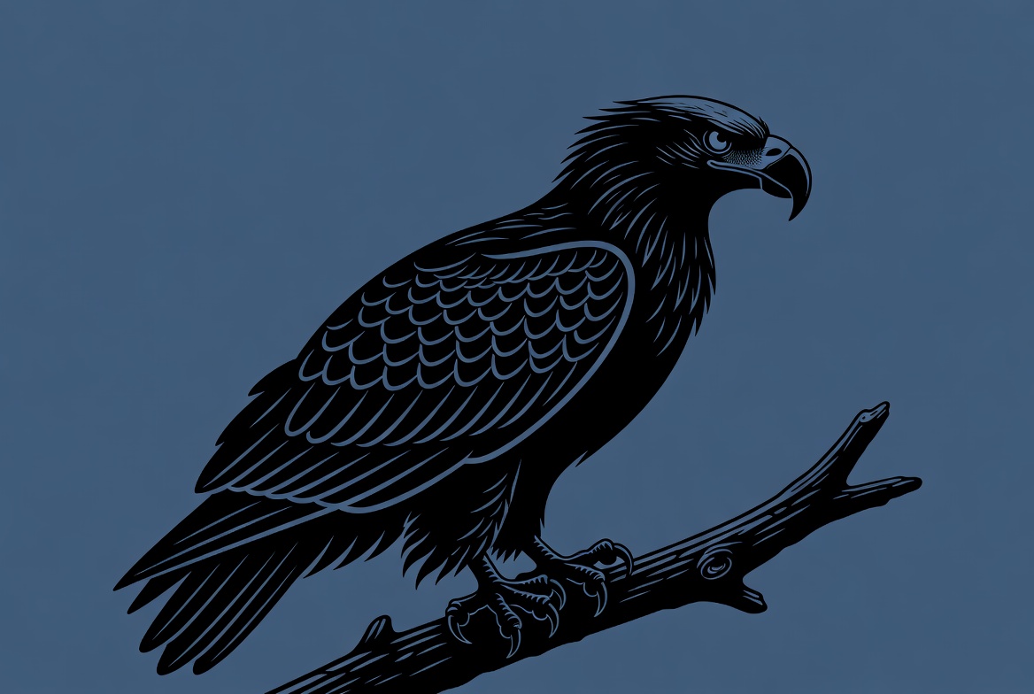 A detailed black silhouette illustration of a bald eagle perched on a wooden branch. The eagle features intricate feather patterns, sharp talons gripping the branch, and a fierce profile against a dark blue background. It is depicted in a side view with wings slightly folded.
