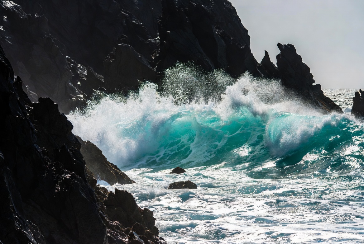 Turquoise waves crashing on rocks