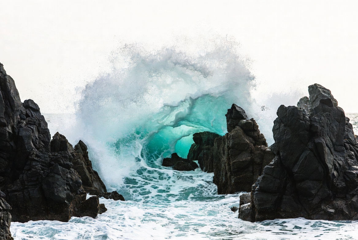 A powerful turquoise ocean wave dramatically crashes between jagged black rocks. White foam sprays high into the air as the wave curls and breaks forcefully. The scene features a bright white sky and turbulent sea water surrounding the rocks.