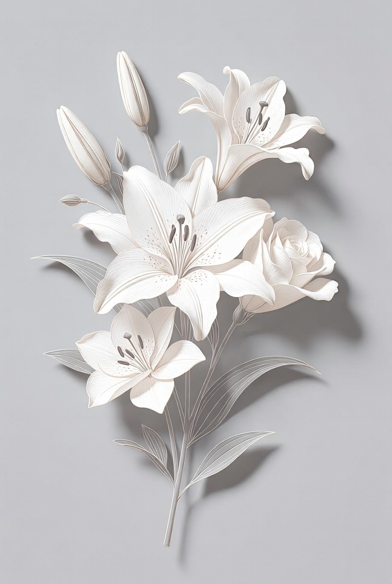 A bouquet of white lilies with elegant petals and long stems is arranged against a light gray background. The flowers feature detailed stamen and subtle shadows for a 3D paper-cut effect. Green leaves accent the pristine white blooms.