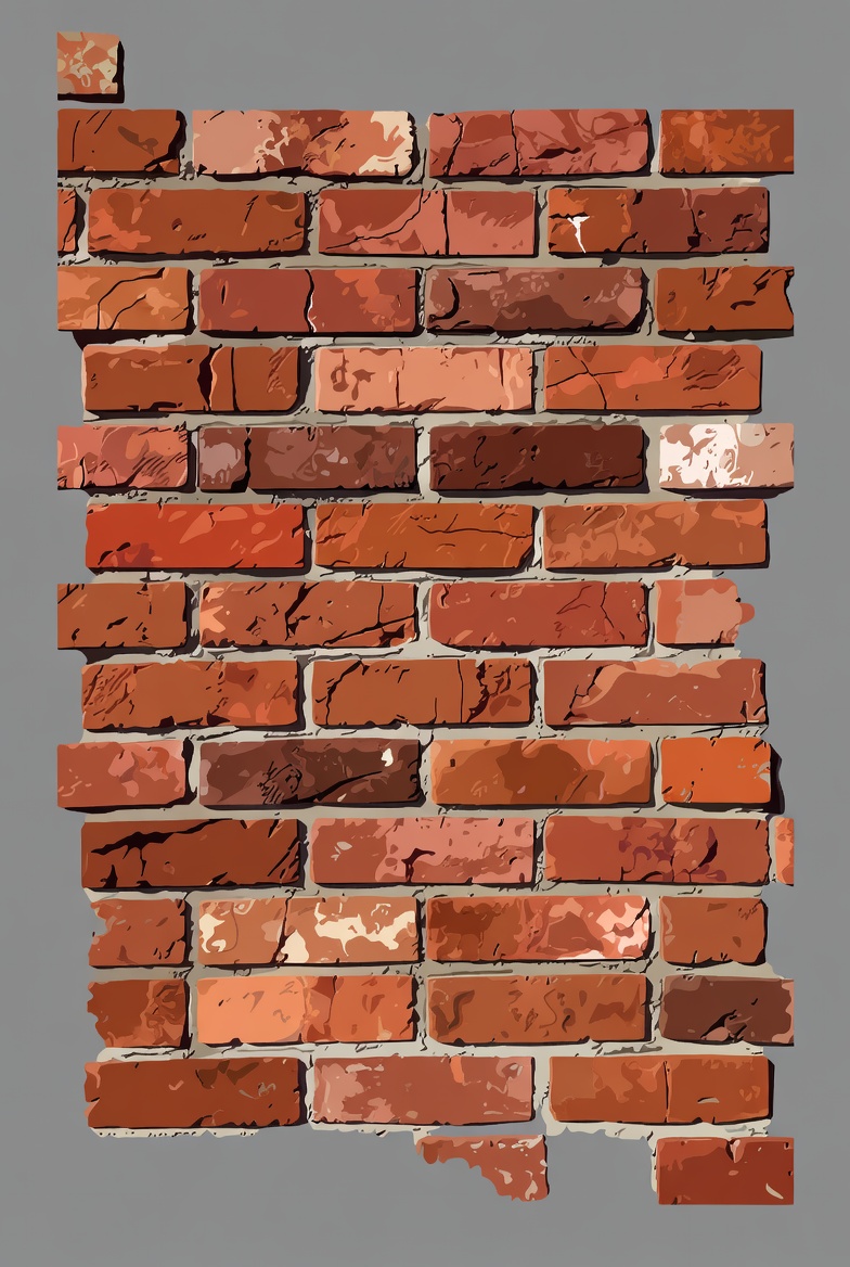 A detailed illustration of a weathered red brick wall with irregular bricks and some white mortar spots. The wall is set against a solid gray background, emphasizing its texture and cracks. The vector-style artwork highlights the rustic construction elements.