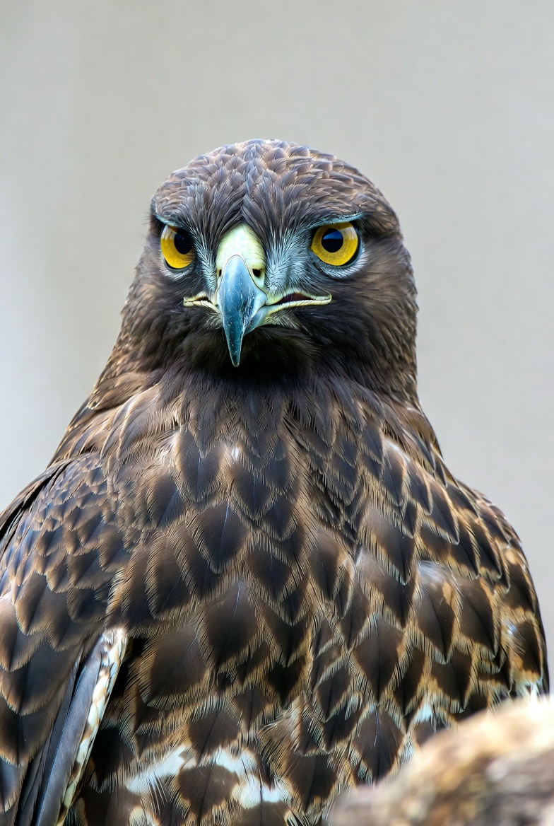avian, bird, bird of prey, blue beak, brown hawk, close-up, detailed feathers, eagle-like, feathers, intense gaze, isolated background, predator bird, raptor, wildlife, yellow eyes, hawk