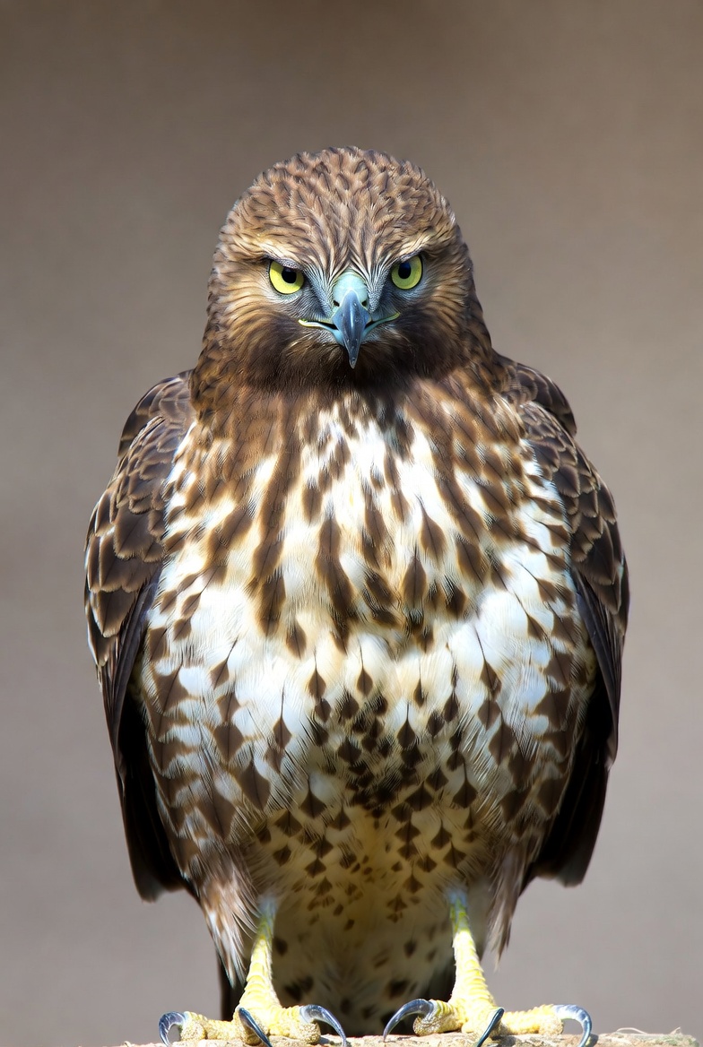 avian, bird, bird of prey, branch, brown feathers, feathers, green eyes, hawk, isolated background, perched, predator, raptor, sharp eyes, talons, white streaks, wildlife, yellow beak, yellow legs, red-tailed hawk